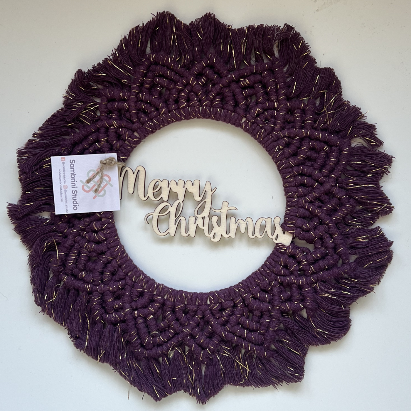 A delicate laser-cut “Merry Christmas” wreath, the wooden centre is framed by a soft macramé mandala-style wreath around the edge. Choose from a golden natural finish or a dreamy purple-gold twist. Each one is handmade using recycled cotton cord by Bobbiny and finished with care for a unique artisan accent.